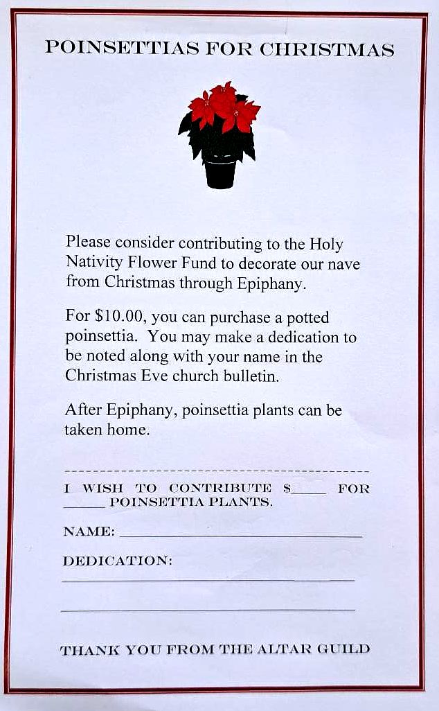 On Sunday, please look for the red box outside the nave, and make your order for the beautiful poinsettia plants that will grace our church at Christmas season.