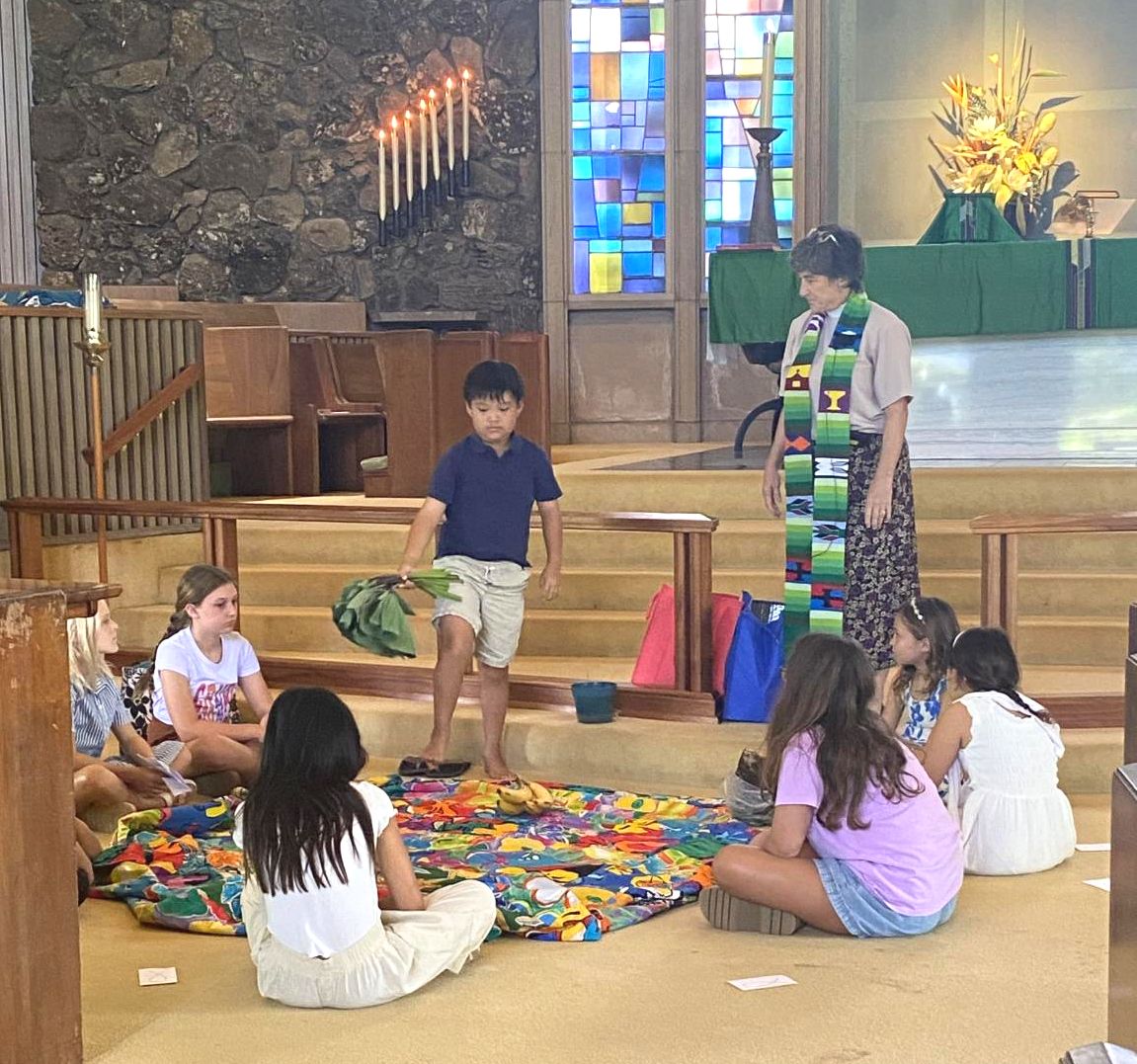 Last Sunday, Rev. Libby helped us celebrate "Creation Care" season. Those who gathered up front helped form our "island" of O'ahu, with fish in the ocean all around. They sat together around the island and talked about how God provided the first Hawaiians with all they needed to live and flourish here. Then keiki took home samples of the food these early residents had in abundance: bananas, coconut, kalo roots and leaves, yam and sweet potatoes.