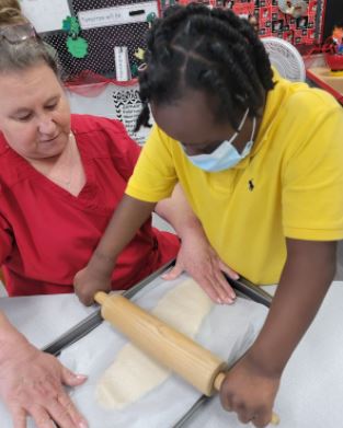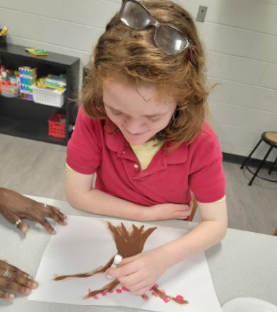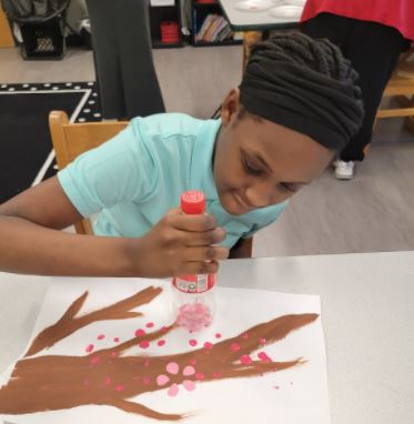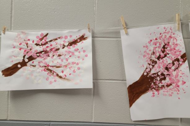 While learning about the National Cherry Blossom Festival in Washington, DC, and the local Macon Cherry Blossom Festival, Ms. Cox’s class got creative. Students made cherry tree paintings using empty soda bottles and q-tips. They later made cherry blossom cookies and enjoyed icing and eating them for a snack. These activities provided excellent opportunities for students to engage in expressive communication and relevant life skills.