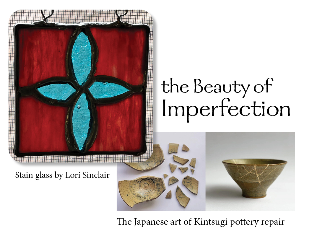 I was recently sharing this with my friend Julie Thauer because I had made a stained glass piece for Deacon Nancy, a true artist of all sorts. I wanted Julie to look at it before I gifted it. I remember saying, “If I hold it this far away…you can’t see this mistake.” Julie just looked at me with her kind eyes, smiled, and shook her head. She said that she was reminded of a Japanese art called kintsugi, which I had never heard of. It is the art of repairing broken pottery using lacquer mixed with powdered gold, silver, or platinum, highlighting–rather than hiding–fractures. It’s actually a beautiful tradition that celebrates imperfections and turning broken items into more beautiful and resilient pieces.