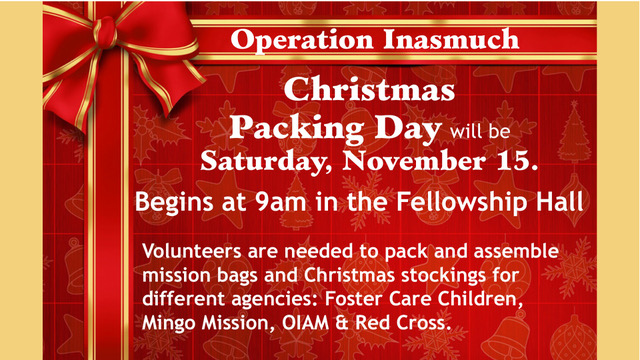 National Collection Week is November 17–24, and Snyder’s Shoebox Dedication Sunday is November 23! Boxes are ready for you in the Gathering Hall and Cammack Lobby.