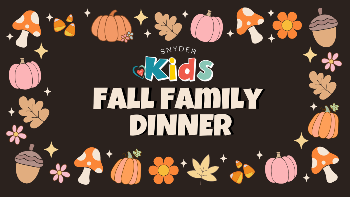 Join Snyder Kids for a not-too-spooky Halloween-themed Wednesday Night Dinner! Bring your family and friends for an evening of fun, candy, and connection. Kids will enjoy a special Halloween-themed meal, while adults will have the regular dinner menu. It’s the perfect night to celebrate together!