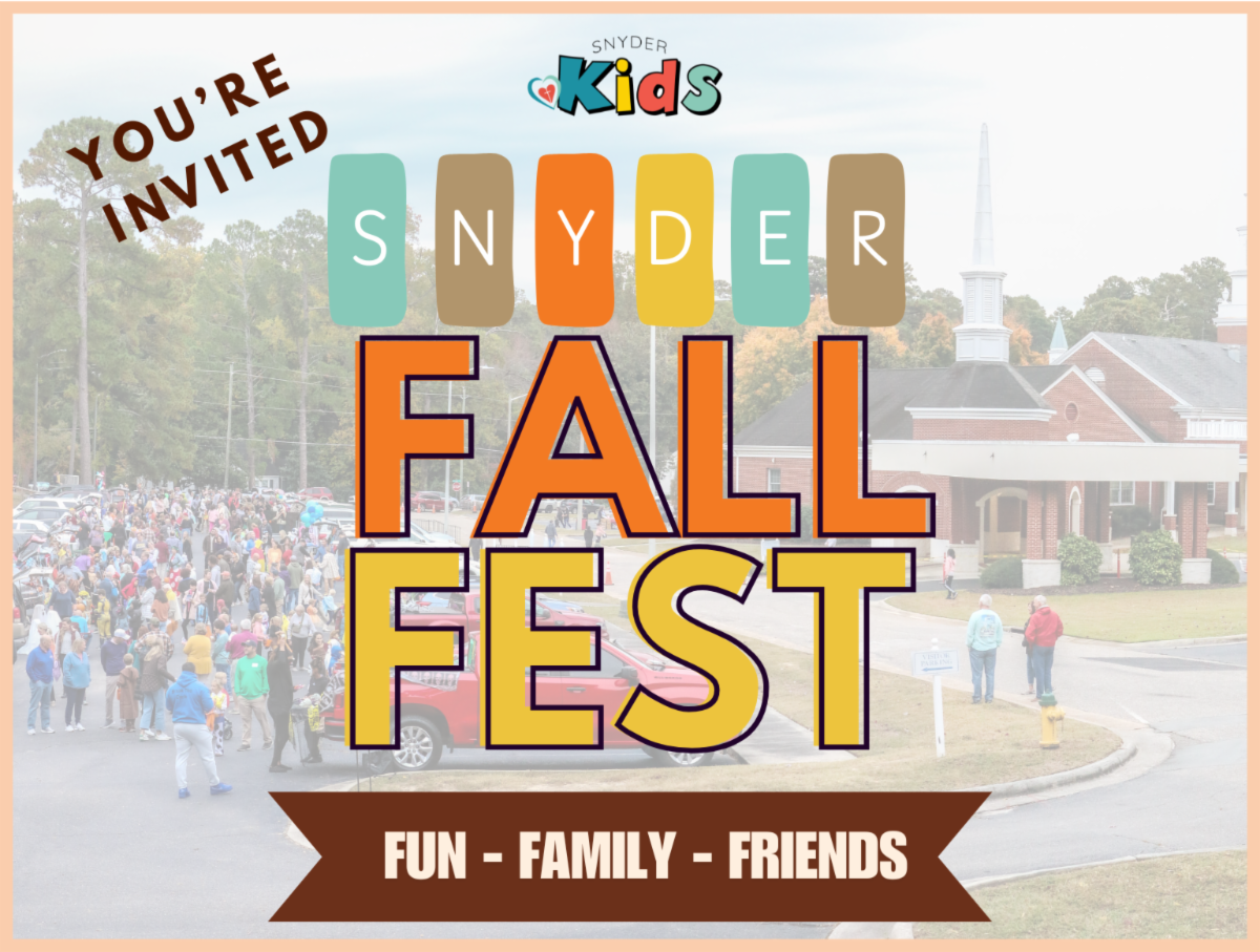 | | Join us for Snyder Kids Fall Fest on Sunday, October 26 at 4:30 PM! Enjoy games, inflatables, costumes, trunk-or-treat, and candy for all. It’s a fun night for families and a great way to share God’s love with our neighbors. | | | | |
