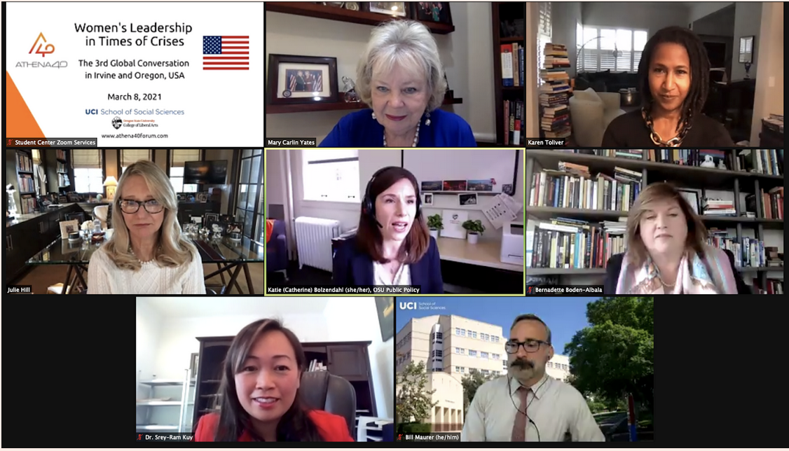On March 8 - International Women's Day - SPP co-sponsored the U.S. West Coast panel of the Global Conversation about Women's Leadership in Times of Crisis with UC Irvine. This event, organized by the Athena40 organization brought together coordinated panels from 10 cities across European, Asian, and African nations. OSU panelists included Ambassador (ret.) Mary Carlin Yates, an OSU Foundation Trustee, and Dr. SreyRam Kuy ('00), Deputy Chief Medical Officer for Quality & Safety for VISN 16. They joined fellow panelists Julie Hill (Anthem Lord Abbett Mutual Funds), Karen Toliver (Sony Creative), and Berndette Boden-Albala (UCI Public Heath).