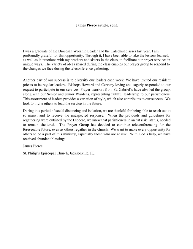Churches across the Diocese of Florida have met the challenge to continue ‘being church’ amidst the challenges of self-isolation and social distancing over the last months. Here is one example of a parish’s lay-led prayer group meeting these challenges. The article is by James Pierce of St Philip’s Church, Jacksonville and graduate of the Licensed Lay Ministry School of the Diocese.