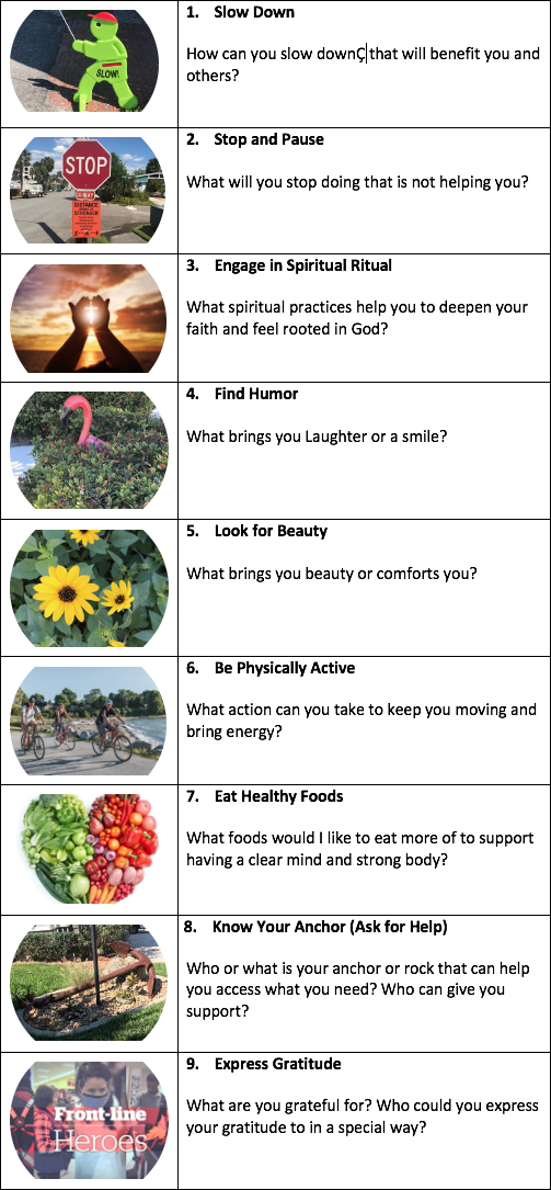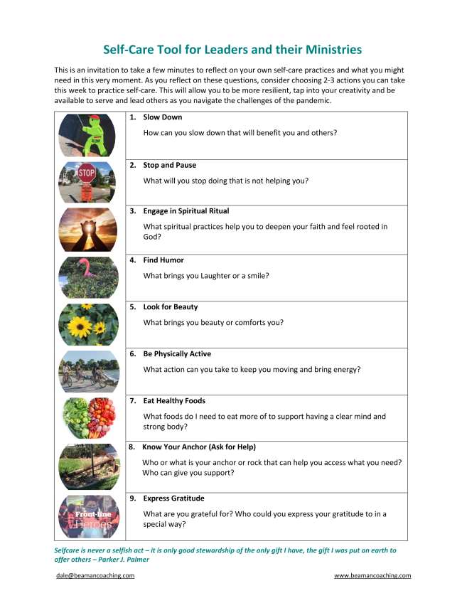 Self-care is about honoring ourselves and our potential, however, it does not come naturally or easily for many. Yet, not practicing self-care has a price on our mind body and spirit – and ability to lead others. Below is an easy tool that you can use with yourself and with your team or ministries to get people thinking about self-care practices. This is an invitation to take a few minutes to reflect on your own self-care practices and what you might need in this very moment.