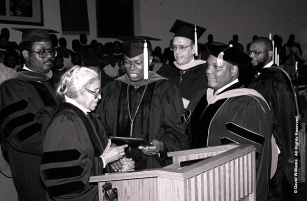 Rosa Parks receiving an Honorary Degree from Edward Waters College in Jacksonville, Florida, by Bishop Frank C. Cummings, presiding bishop of the AME Church. Directly behind the Bishop is Preston Haskell, long time member of St. Mark’s Church, Jacksonville.