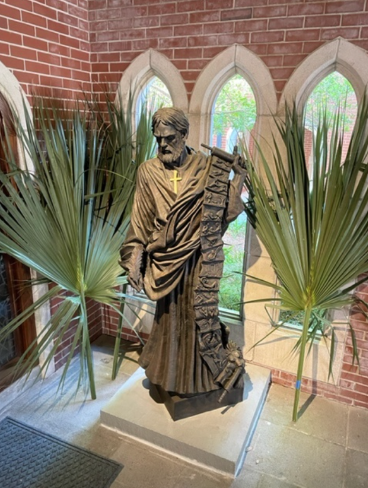 To mark the 100 anniversary of St. Mark’s Episcopal Church, Jacksonville, a life-size bronze statue of St. Mark the Evangelist has been dedicated and placed in the heart of the church campus in the walkway just outside the sacristy. The statue is by the distinguished Canadian sculptor Timothy Schmalz who creates sculptures primarily in bronze. For over 25 years Timothy has been sculpting large scale pieces installed worldwide and notably in historical churches in Rome and in the Vatican. This impressive sculpture is a gift to St. Mark’s from The Rev. Lila Byrd Brown who has exercised a vital ministry in St. Mark’s and in the Diocese of Florida over many years.