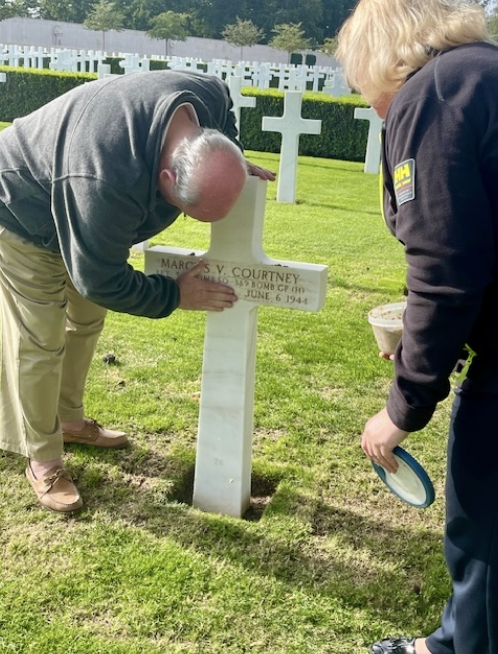 William Courtney cleaning his Uncle Vince’s tombstone in Cambridge (UK) and putting sand from the Normandy beaches into the engraving, so it shows up well. That is the custom. | |