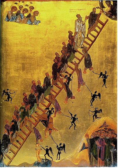 There is a well-known icon in Orthodoxy, known by the same name, Ladder of Divine Ascent, that is associated with John Climacus. (I have a small copy of it here in my office as I write this.) Several monks are climbing the rungs of the ladder; at the top is Jesus, arms outstretched, prepared and ready to pull them into heaven. All along the ladder there are angels assisting the climbers—but there are a few tiny demons as well on the latter side of the ladder, attempting to shoot them down, and there are a few dear figures falling downwards off the ladder. In the lower right-hand corner stands John Climacus, arms outstretched, beholding the drama of souls yearning in their hearts and steps towards the outstretched arms of Jesus.