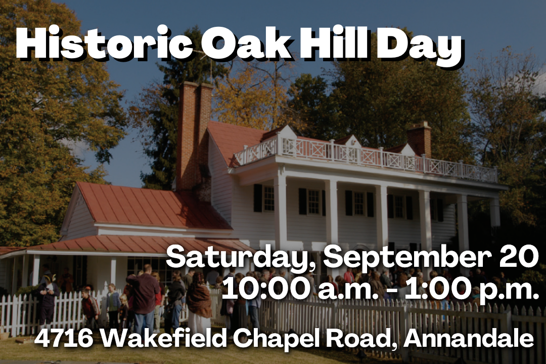 Take a tour of historic Oak Hill, one of the oldest homes in Fairfax County, on Saturday, September 20, from 10:00 a.m. - 1:00 p.m. This annual open house provides an opportunity to go back in time and rediscover our community roots. Oak Hill Manor is located at 4716 Wakefield Chapel Road in Annandale.