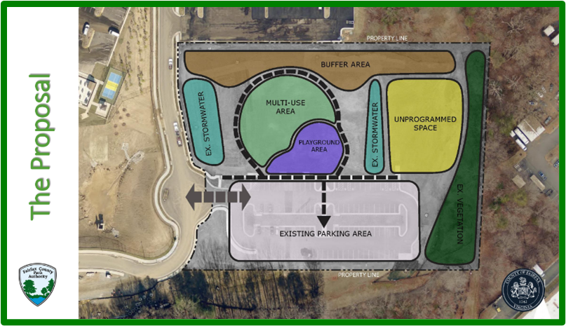 The Park Authority presentation noted that there is a need for more playgrounds in the area as well as unprogrammed open space that can be used for passive or active play and they presented a concept layout showing an all-abilities multi-generational park to serve all members of the community. Participants in the meeting expressed support for the concept and made valuable suggestions regarding the specifics of the design.