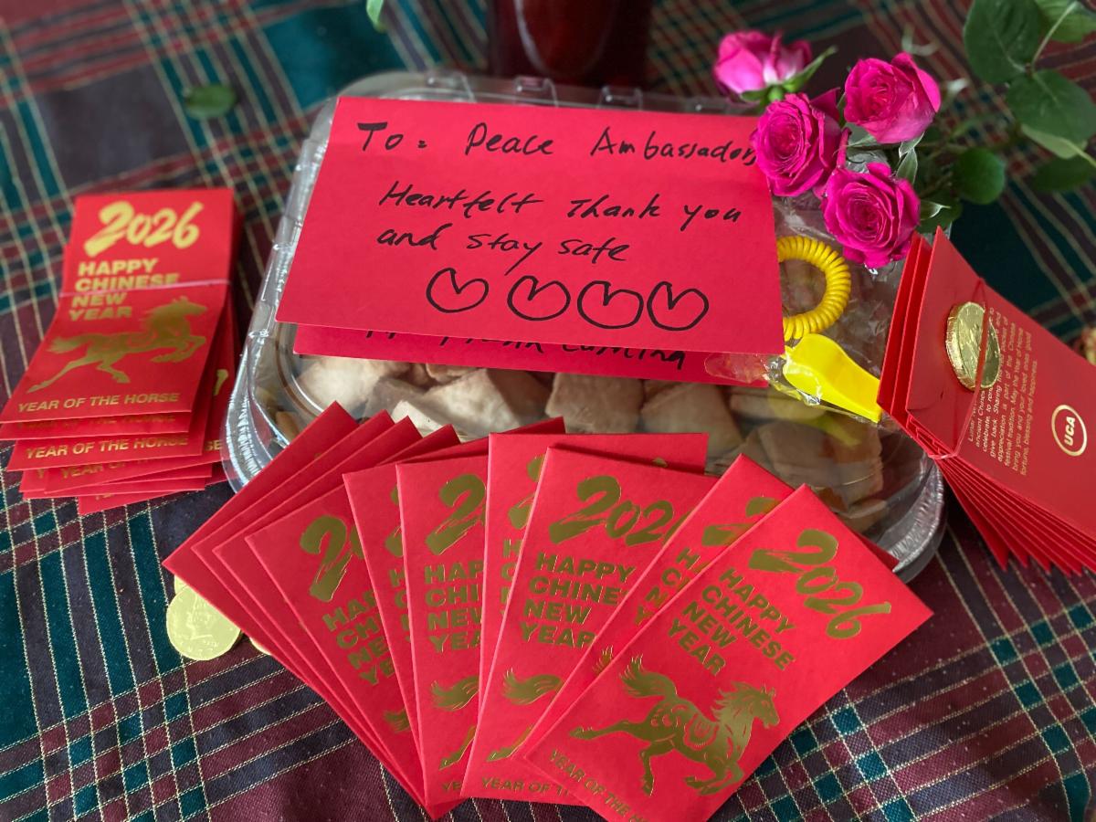 Their presence brought warmth to our team — even in the cold — and reminded us of the power of kindness. The oldest monk among them is 70 years old, a beautiful testament to a lifetime of compassion. We were honored to share homemade cookies baked by our team member, Laura, as well as red envelopes filled with chocolate gold coins to symbolize good luck and blessings for the Lunar New Year. We wish them all the best on their journey, and hope they feel our solidarity with their mission.