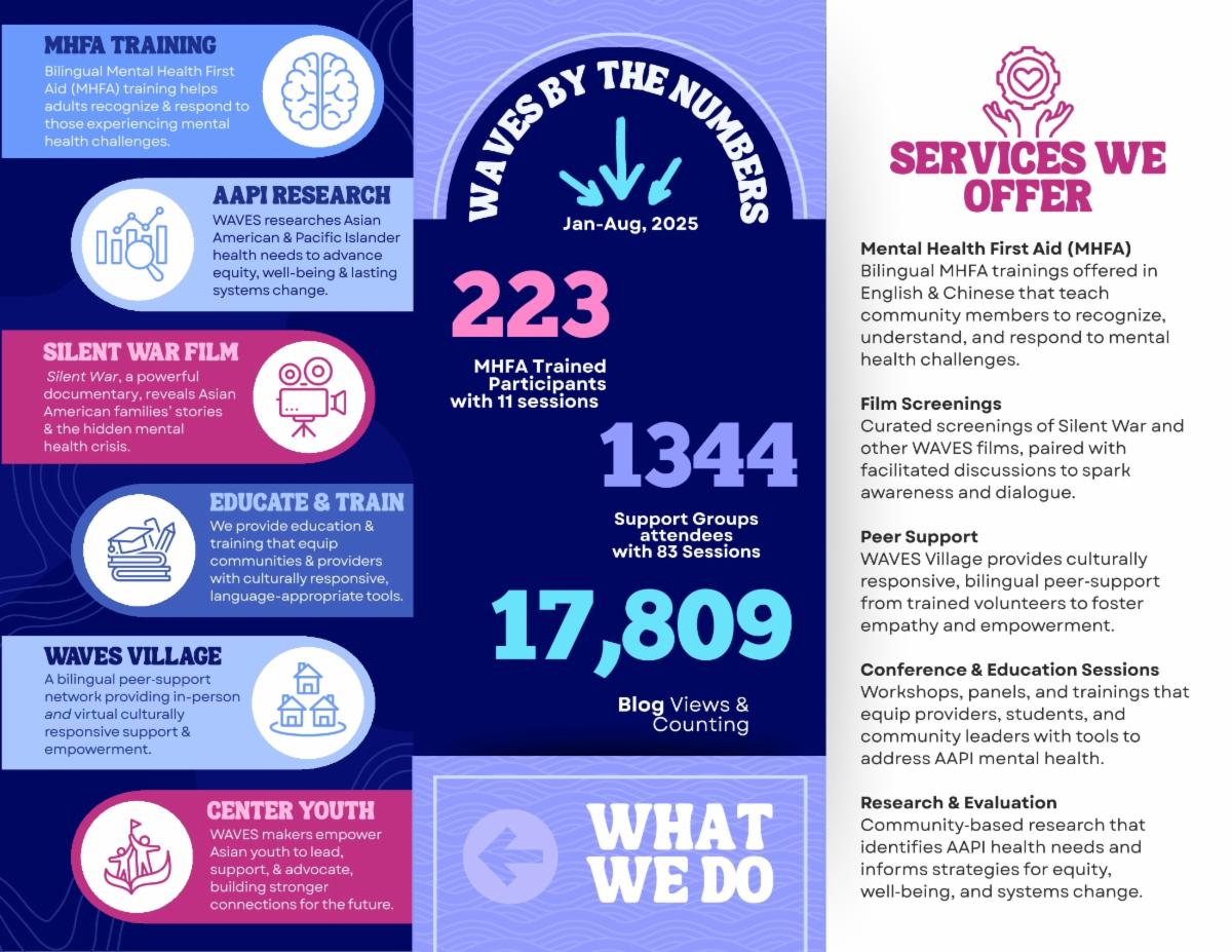 When parents and children are raised in different cultures, their understanding of mental health can differ greatly, making communication difficult and stigma harder to break. Our executive director, Lily Chen, shared how community struggles inspired her to found WAVES. Dr. Jennifer Tu, child and adolescent psychiatry fellow at UCLA and WAVES board secretary, reflected on how the loss of a friend to suicide shaped her advocacy. Naialie Lor, a pre-nursing student at The University of North Carolina at Chapel Hill and administrative assistant at WAVES, brought the perspective of a second-generation AAPI youth navigating cultural expectations.