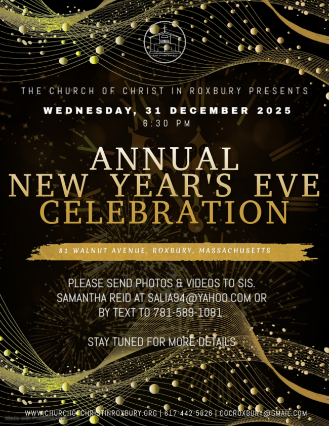Annual New Year’s Eve Celebration: Wednesday, December 31, 2025, beginning at 6:30 p.m. Please send photos/videos for the Year in Review slideshow to Sis. Samantha Reid via email to salia94@yahoo.com or via text to 781-589-1081. Details to come.