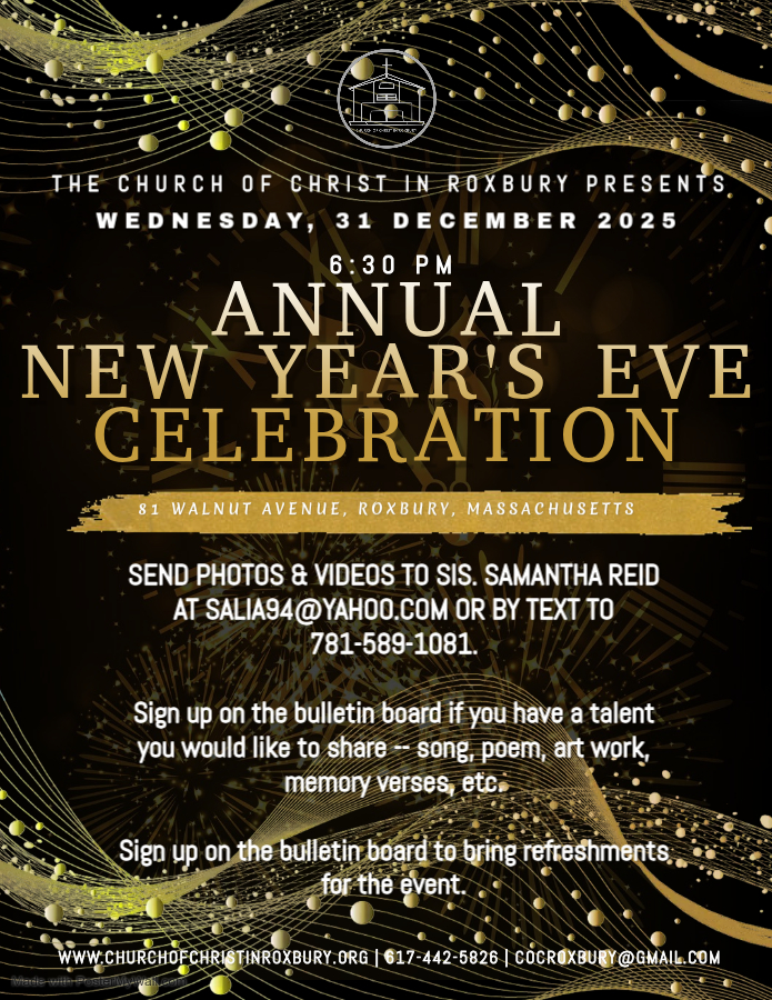 Annual New Year’s Eve Celebration: Wednesday, December 31, 2025, beginning at 6:30 p.m. Please send photos/videos for the Year in Review slideshow to Sis. Samantha Reid via email to salia94@yahoo.com or via text to 781-589-1081. Details to come.