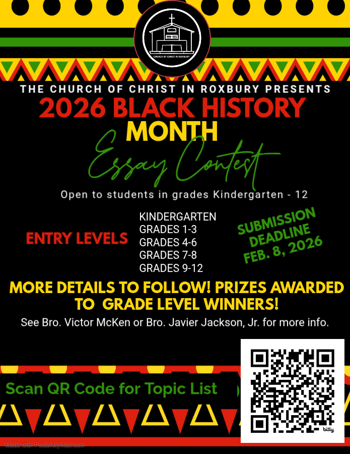 Roxbury 2026 Ladies’ Day: Save Saturday, March 7, 2026, for our Annual Ladies’ Day. Our speaker will be Sis. Glinda Meadows from the Bouldercrest Church of Christ in Atlanta, Georgia. Registration is now open for this event. Scan the QR code or click the link in the invitation flyer in the Women's Ministry section of the e-bulletin to register. The cost for Roxbury sisters is $90 for ages 19 & up; $45 for ages 12-18. Submit your payments via our e-giving link with a note designating it as a Ladies' Day Payment, or by cash or check to a member of the Ladies' Day Planning Team.