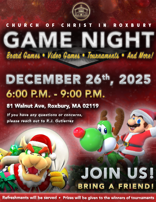 | | For Game Night, we are asking anyone who has board games, card games, or a specific video game they want to bring for the PS5, Xbox Series X, or Nintendo Switch to bring them all to Game Night. Anyone interested in bringing their game console must speak with R.J. Gutierrez before bringing it to Game Night. | | Please note change of time for this event. We will have our regular mid-week Bible class at 6:30, and this event will begin at 8:00 p.m. | | The men's breakfast is free and open to all men who are interested in attending. For anyone interested in making a donation, please send it via our e-giving link and indicate that it is for the Men's Breakfast. Also, any brother interested in helping out in any way, especially with finalizing and planning the men's breakfast, to please see R.J. Gutierrez. Lastly, we're asking all men to register if they haven't already, so we can get an accurate count for food. Click here to register to attend! | | |