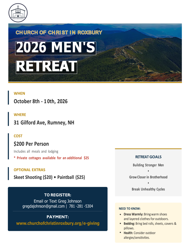 2026 Roxbury Men's Retreat: October 8-10 in Rumney, NH. See Upcoming Events section of the e-bulletin for details.