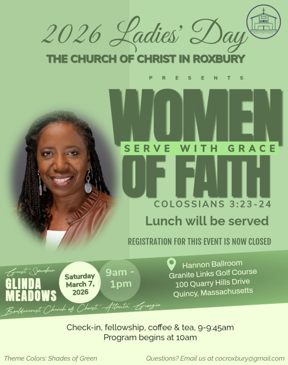 2026 Roxbury Ladies’ Day: Registration is closed. If you signed up but haven't yet paid, please see a member of the planning committee to confirm your attendance. Van transportation is available, departing from the church building at 8:00 a.m. See Sis. Sarah Williams to be added to the van list. Please note that we will not be serving breakfast but will have light snacks and coffee and tea available at the beginning of the day, and there will be a full lunch at lunch time.