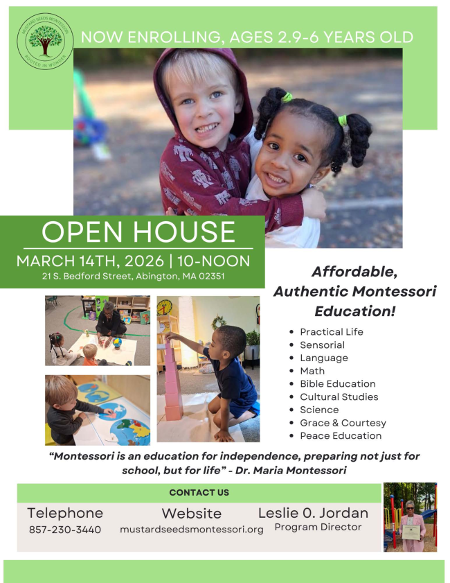 Mustard Seeds Montessori Open House: Saturday, March 14th 10 a.m. – noon, 21 S. Bedford Street, Abington. Now enrolling, ages 2.9 – 6 years old. Program Director, Sis. Leslie O. Jordan. See e-bulletin for contact information.