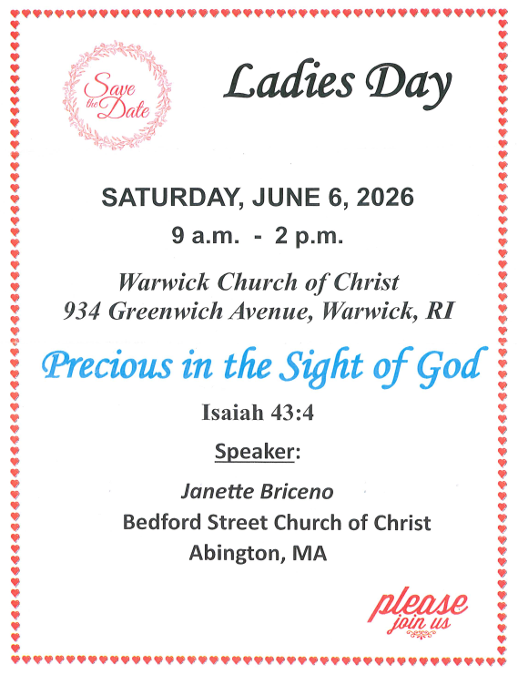 Warwick CoC Ladies' Day: Saturday, June 6th. Keynote Speaker: Sis. Janette Briceno. A sign-up sheet will be posted on the bulletin board.