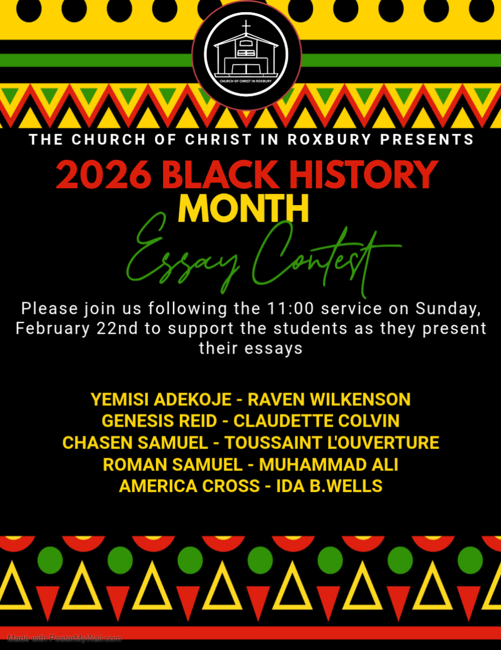Black History Month Essay Contest: Please join us after the 11:00 worship service on Sunday, February 22nd for the entrants’ presentations.