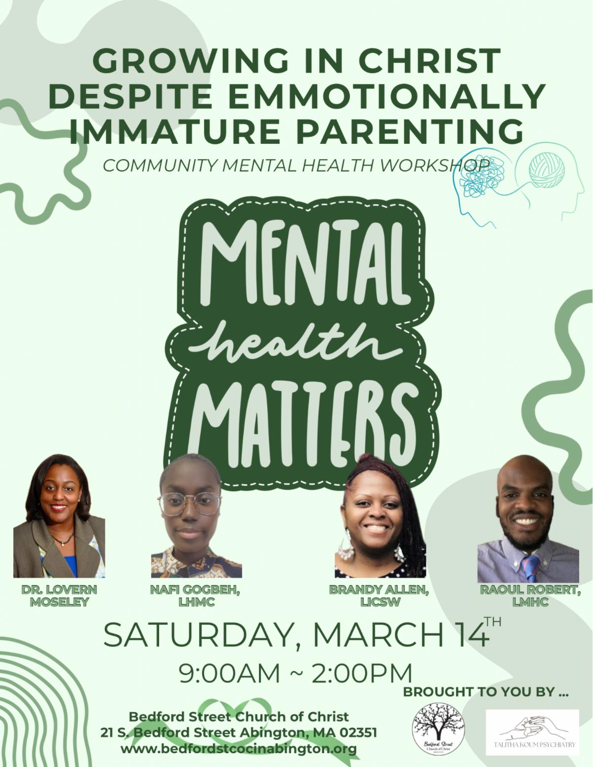 Community Mental Health Workshop: On Saturday, March 14th, 9 a.m. – 2 p.m., the Bedford Street congregation will host “Growing in Christ Despite Emotionally Immature Parenting,” a community mental health workshop. RSVP to rsvp to church@bedfordstcocinabigton.org. Continental breakfast and box lunch will be provided. Location: 21 S. Bedford St., Abington, MA.