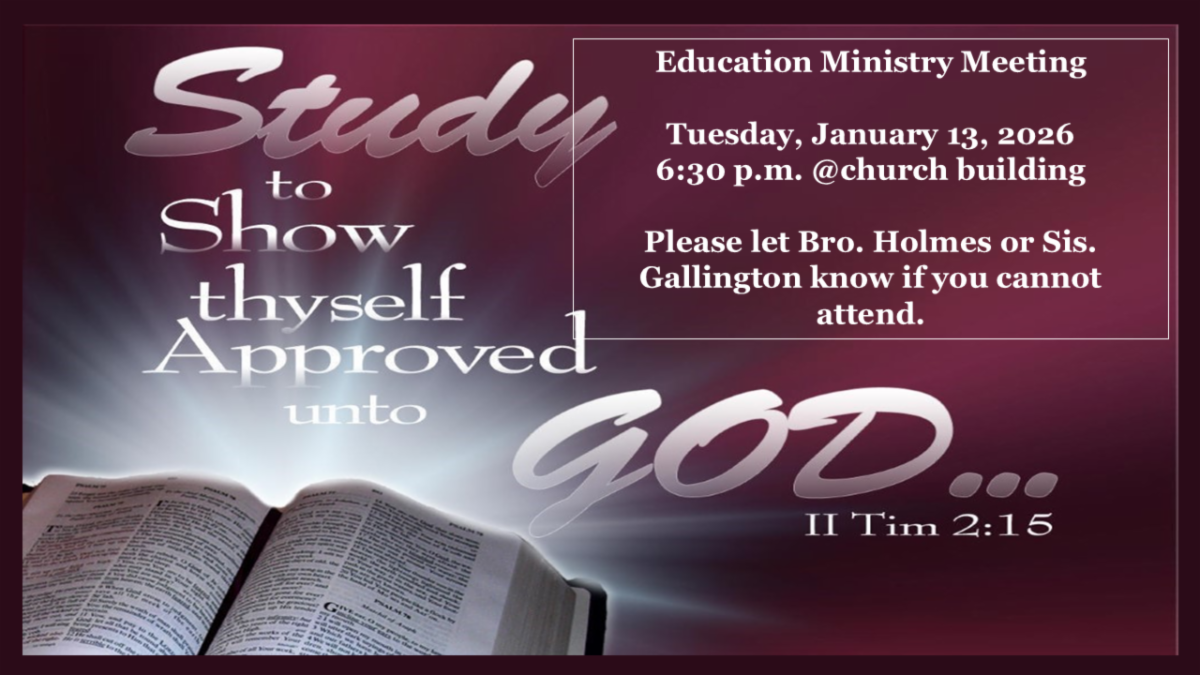 Education Ministry Meeting: Tuesday, January 13th, 6:30 p.m. at the church building. Please let Bro. Holmes or Sis. Gallington know if you cannot attend.