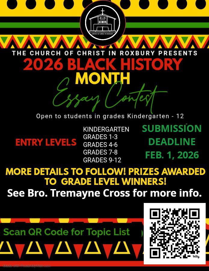 Roxbury 2026 Ladies’ Day: Save Saturday, March 7, 2026, for our Annual Ladies’ Day. Our speaker will be Sis. Glinda Meadows from the Bouldercrest Church of Christ in Atlanta, Georgia. Registration is now open for this event. Scan the QR code or click the link in the invitation flyer in the Women's Ministry section of the e-bulletin to register. The cost for Roxbury sisters is $90 for ages 19 & up; $45 for ages 12-18. Submit your payments via our e-giving link with a note designating it as a Ladies' Day Payment, or by cash or check to a member of the Ladies' Day Planning Team.