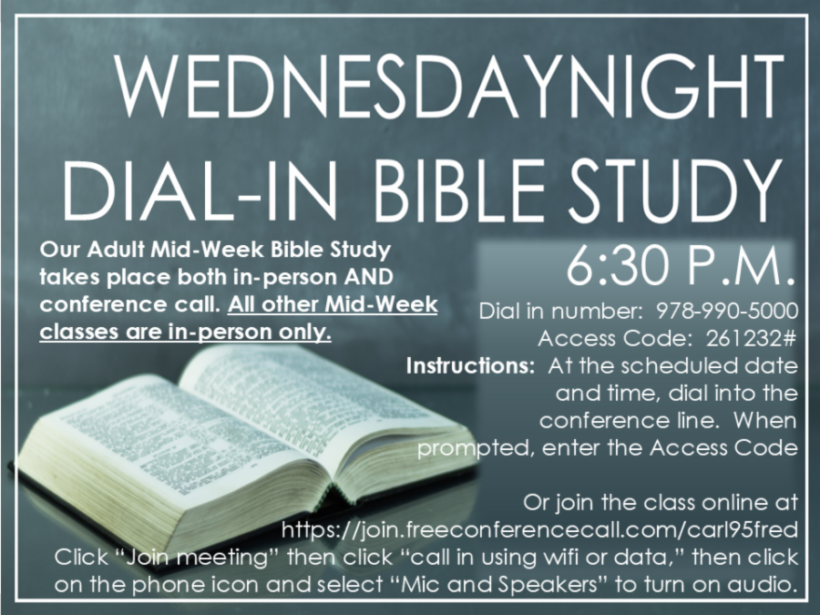 - Mid-Week Bible Study (Wednesdays @ 6:30pm) in person and VIA TELECONFERENCE (connection info below)