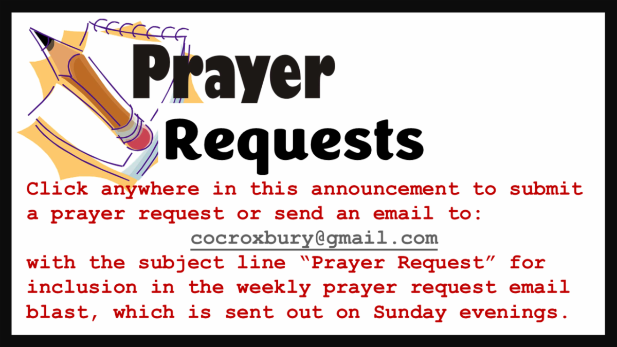 | | | Click anywhere in the announcement above to submit your prayer request, or send an email directly to cocroxbury@gmail.com | | | Our congregation has a subscription to PTP365, an online library of 1000s of lessons on dozens of topics. All members are eligible to join the congregation's PTP365 account (one shared login per family). See Bro. Gallington to request access. | | | Note on Baptismal Certificates: If you are a new convert and have not received your baptismal certificate, please see Sis. Sandra Wade or Sis. Gloria Jean Gallington. If they do not have your certificate, please give them your name and they will see that a certificate is printed for you. | | |