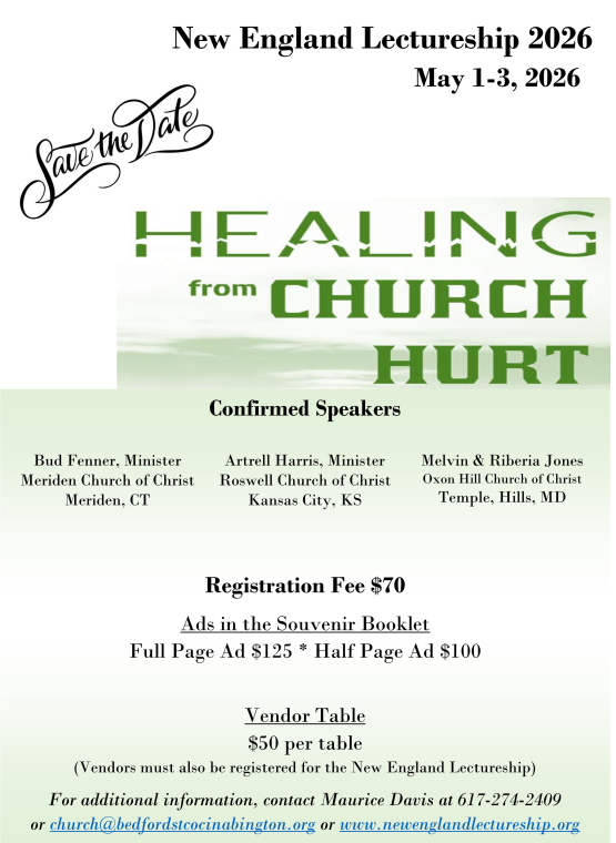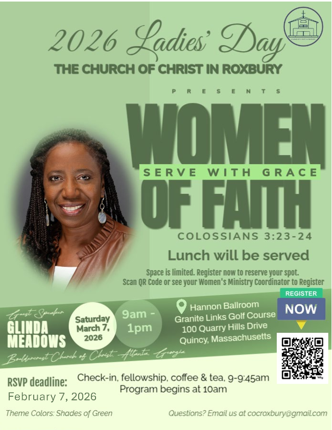 Roxbury 2026 Ladies’ Day: Save Saturday, March 7, 2026, for our Annual Ladies’ Day. Our speaker will be Sis. Glinda Meadows from the Bouldercrest Church of Christ in Atlanta, Georgia. Registration is now open for this event. Scan the QR code or click the link in the invitation flyer in the Women's Ministry section of the e-bulletin to register. The cost for Roxbury sisters is $90 for ages 19 & up; $45 for ages 12-18. Submit your payments via our e-giving link with a note designating it as a Ladies' Day Payment, or by cash or check to a member of the Ladies' Day Planning Team.