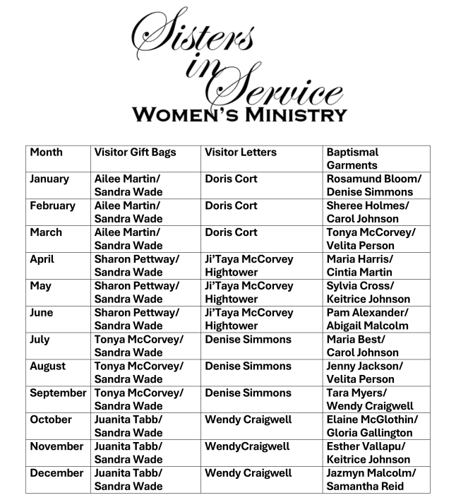 See Bro. or Sis. Gallington, Sis. Nagarajah, or Sis. Keitrice Johnson with any questions.