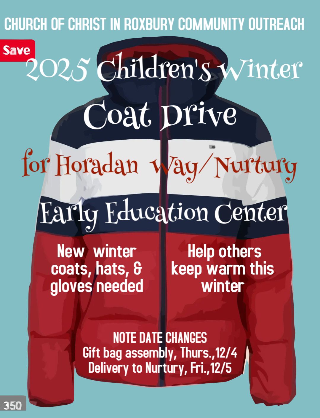 2025 Children’s Winter Coat Drive: If you signed up to provide a coat or coats for our annual Children's Winter Coat Drive, please sign up for a specific gender and size on the bulletin board. Gift bag assembly: Thursday, December 4th; Gift bag delivery: Friday, December 5th. Please note the change of dates for assembly and distribution.