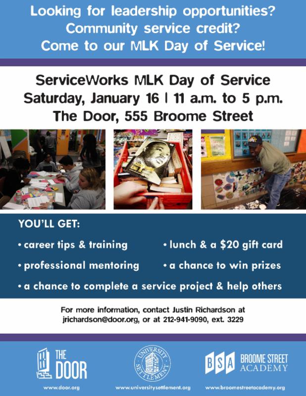 The Door will be hosting a MLK Day of Service at 555 Broome Street. Students will receive career tips and training, professional mentoring, lunch and a $20 gift card, a chance to win prizes, and, most importantly, a chance to complete a service project and help others!