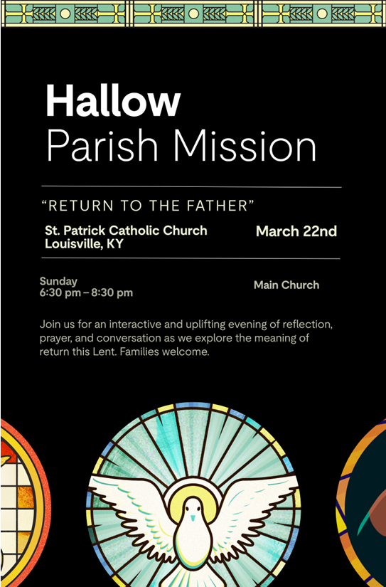 As part of our Hallow partnership, we will also offer a Lenten Parish Mission on Sunday, March 22 from 6:30–8:30 p.m. in the church. Our mission speaker, Casey Phillips from Lexington, will lead us in reflecting on the theme, “Return to the Father.” This will be a family-friendly evening, so please feel free to bring your children and join us for what I hope will be a meaningful time of prayer and renewal. Check out Casey’s video here.