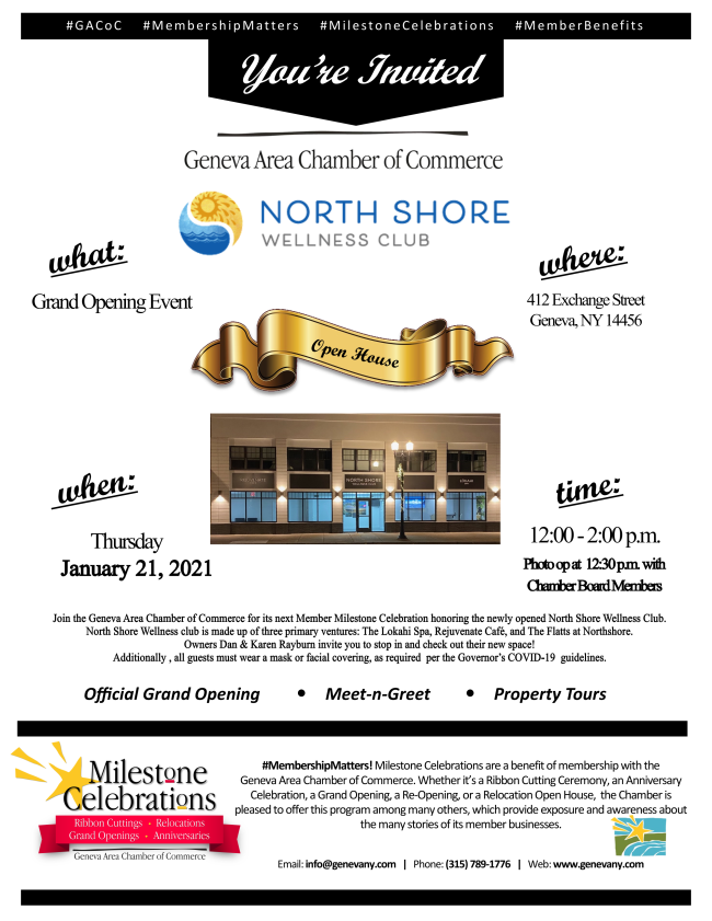 The Geneva Area Chamber of Commerce held a Member Milestone Celebration for North Shore Wellness Club on Thursday, January 21. The event welcomed the newly opened business located at 412 Exchange Street in downtown Geneva. About 30 individuals attended the event and took tours during the open house celebration throughout the day.