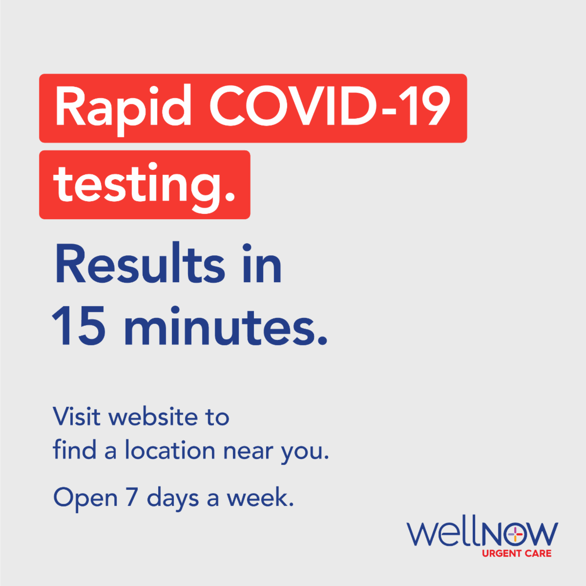 WellNow now offers Rapid COVID-19 testing. Appointments are encouraged and can be made through their website. To find a @wellnowurgentcare location near you, visit www.wellnow.com