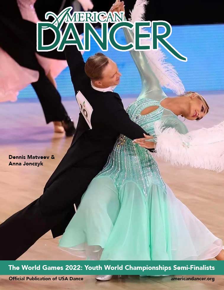 When was the last time you looked at American Dancer, americandancer.org? The current cover features Dennis Matveev and Anna Jonczyk; read about their international camp experience at: https://americandancer.org/international-training-camps-provide-new-perspective-and-opportunities. The Style Section features a new story about Standard dresses through the years and what is on today’s WDSF dance floor: https://americandancer.org/standard-dresses-arent-so-standard-anymore. Also, find interesting commentary: https://americandancer.org/slow-slow-quick-quickmore-than-just-words, the latest information about the 2022 USA Dance National Elections, and some “Let’s Laugh” quotes. American Dancer is looking for articles, commentary, and photos about your USA Dance dancing, friends, chapters, styles, competitions, and events; send them to americandancer@usadance.org.
