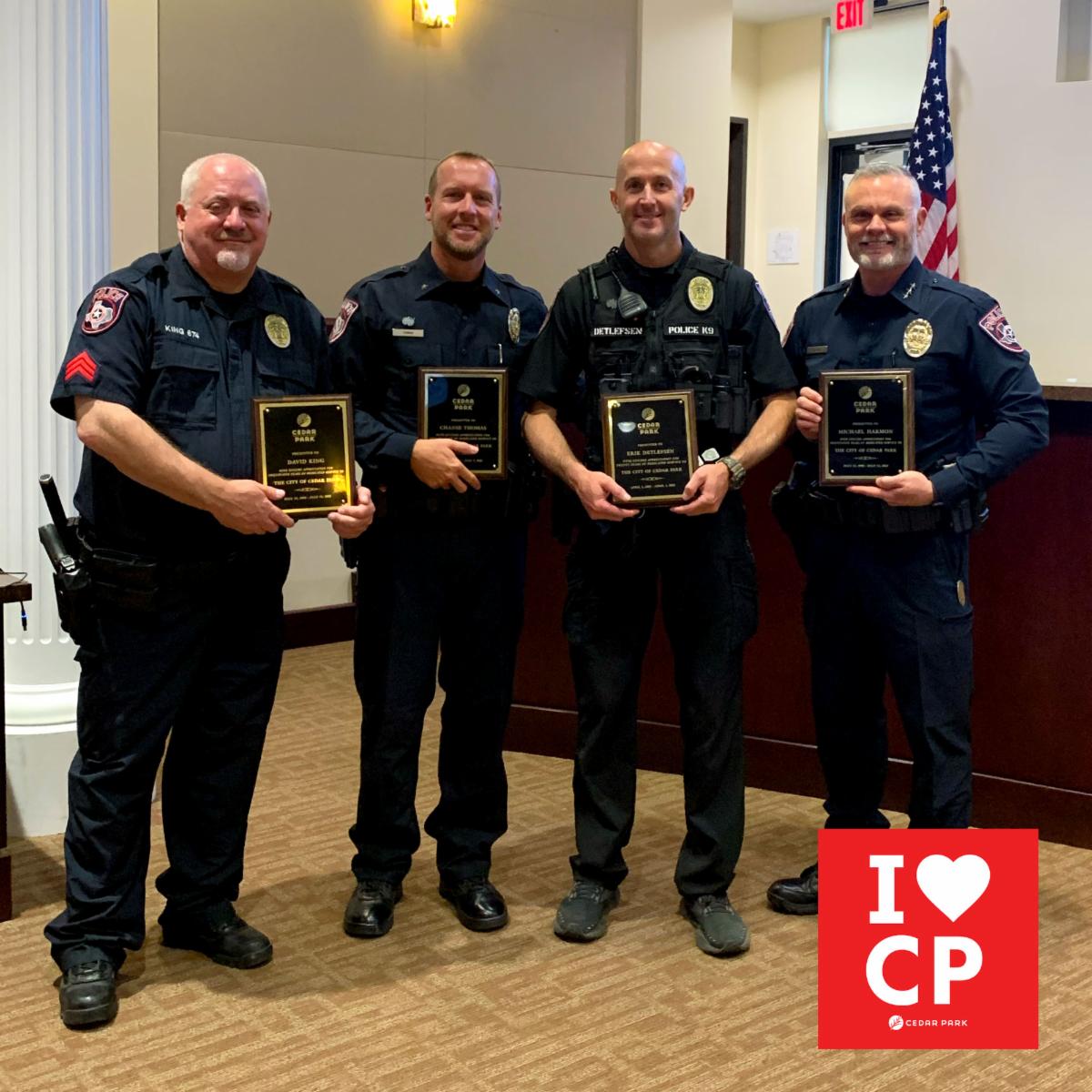 Years of service awards for Chief Mike Harmon, 25 years; Sgt. David King, 25 years; Commander Chanse Thomas, 20 years; and Officer Erik Detlefsen, 20 years