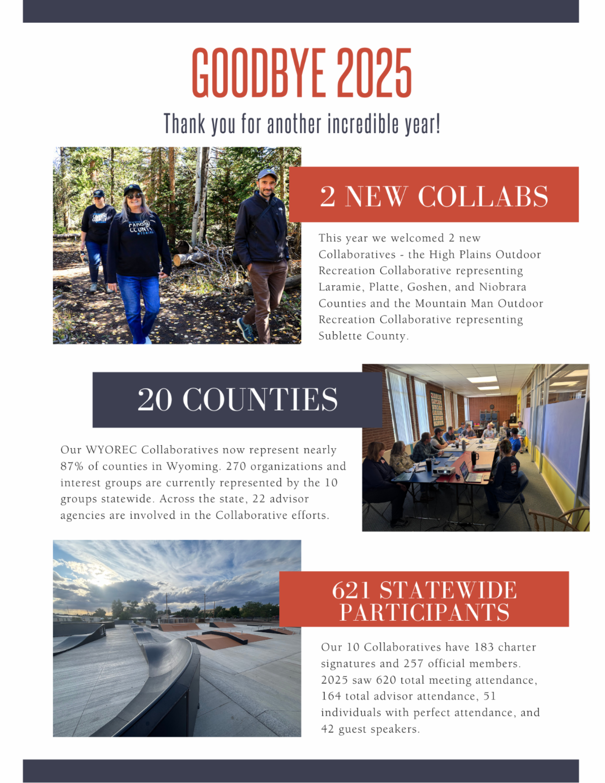 Growth - Two new Outdoor Recreation Collaboratives were established, bringing the total number of Outdoor Recreation Collaboratives in the state to ten, up from eight a year ago. We now have 4 staff members dedicated to supporting and facilitating these groups. From helping communities discover areas of opportunity to aligning project champions with funding options, our Collaboratives continue to connect Wyoming’s people with resources needed to take their projects from ideas to completion.