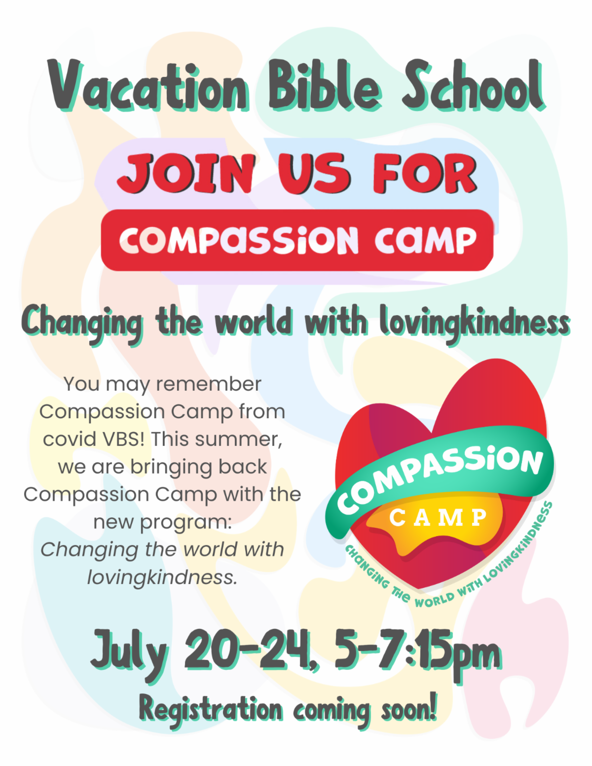 Save the date for VBS! Registration is coming soon. Join us for Compassion Camp: Changing the world with lovingkindness.