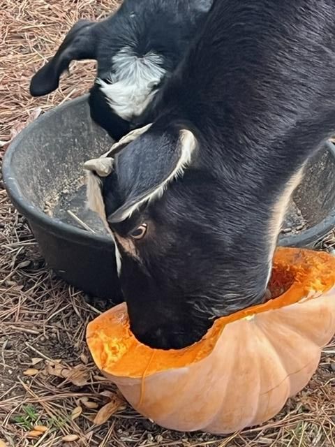 | | The pumpkins that beautifully adorned our church this fall have gone to a very good home! Member Julia Berry took several of them to feed her “spoiled rotten” goats, who were delighted with the tasty treat. Julia shared that her goats—Hank and friends—may not provide milk or cheese, but they make up for it with plenty of hugs, kisses, and personality. Check out the photos below to see their pumpkin feast in action! | | If you need help, or for more information, please email Amy Piland! | | |