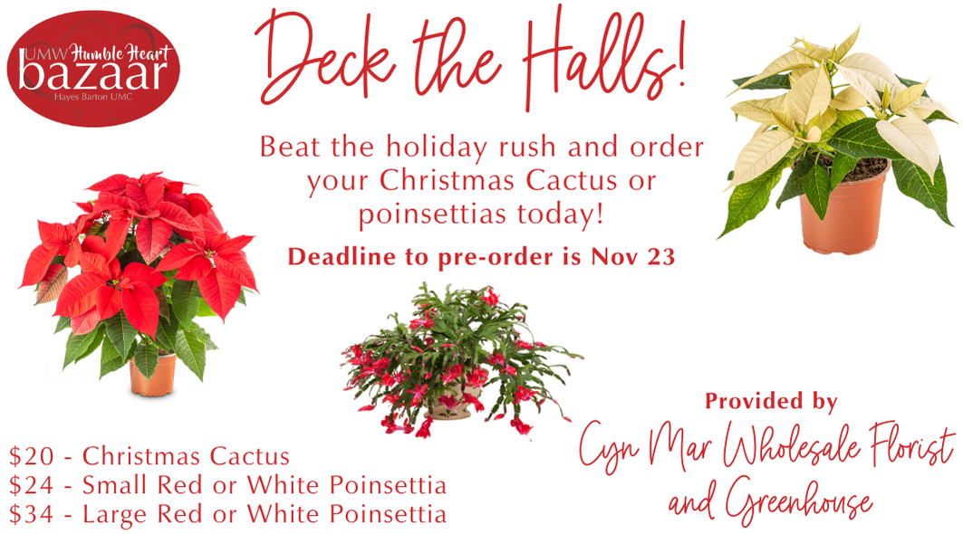 Gorgeous fresh poinsettias and Christmas Cactuses are provided by Cyn Mar Wholesale Florist and Greenhouse—the same trusted local grower that supplies beautiful Christmas greenery to Logan’s Garden Shop. Preorders are open now through November 23, with pickup at HBUMC on December 1. Our volunteers will even load your order directly into your car—making it easy to bring home the beauty and fragrance of the season, while giving back to our community!