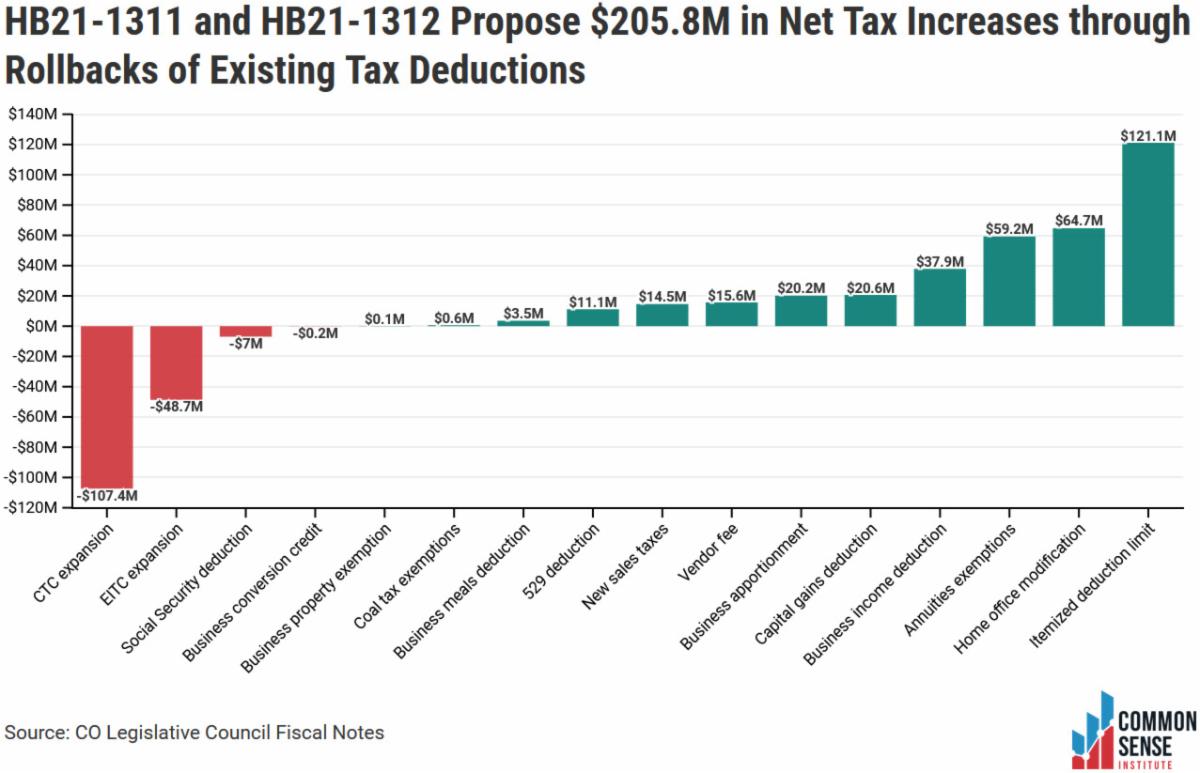 Recently introduced tax reform bills, HB21-1311 and HB21-1312 would eliminate or reduce 12 different tax deductions and increase four. The net effect is not revenue neutral, but rather a $205 Million net increase.