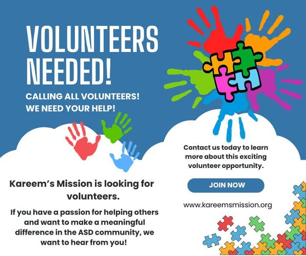 Volunteers Needed! Join us at Kareem’s Mission Autism Center to make a difference for children and families. Flexible hours • Training provided • Impact that lasts a lifetime! Email info@hagirnetwork.com