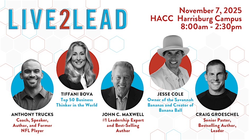 Leadership Harrisburg Area is pleased to partner with Jordan Ames & Red Letter Leadership to bring Live2Lead to Central PA! Live2Lead is an annual leadership gathering developed by Maxwell Leadership. Check out this year’s lineup of national and international all-stars including Jesse Cole founder & owner of the increasingly popular Savannah Bananas, former Pittsburgh Steeler and best selling author Anthony Trucks, award-winning, best selling author Tiffani Bova and more! This intimate gathering will include licensed broadcast segments from the 2025 Live2Lead event with facilitated dialogue and insights shared by local leaders. Participants walk away inspired, motivated, and prepared to lead with renewed passion and purpose.