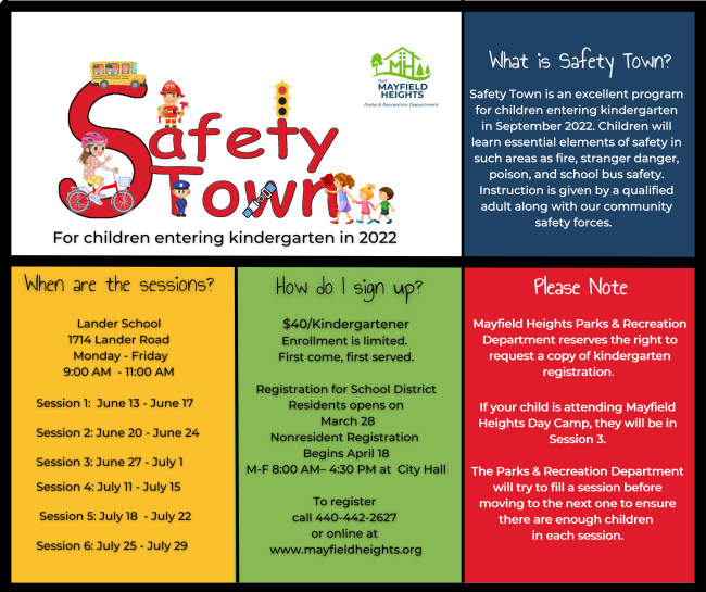 The Police Department will be assisting the Parks & Recreation Department with Safety Town this year. The first session begins on June 13th, and children will learn a variety of topics, including how to safely cross a street and how to deal with strangers. For more information on Safety Town, see the Parks & Recreation brief above.