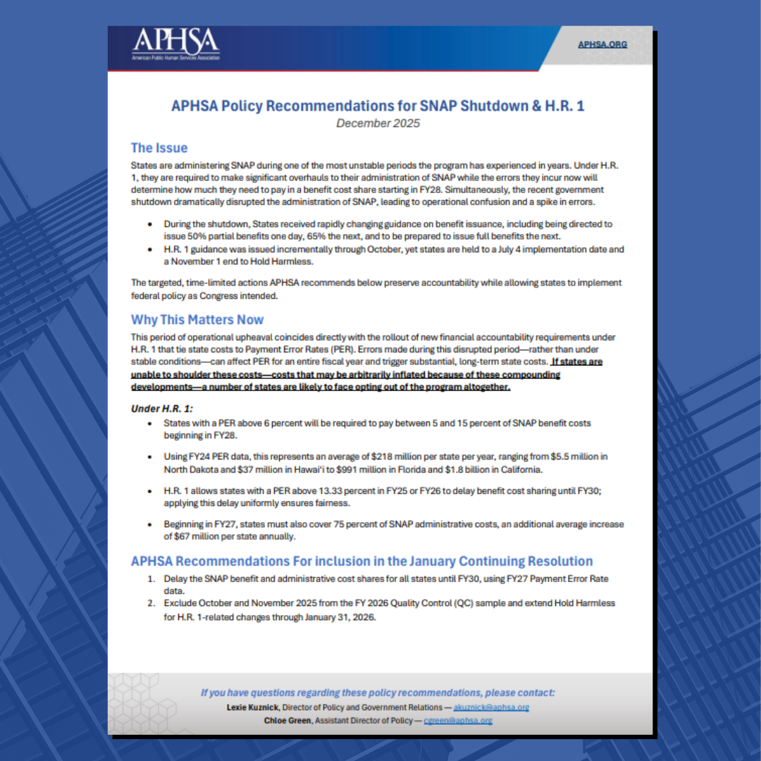 With the guidance of our Leadership Council, APHSA has produced new policy recommendations and accompanying talking points to support state and local leaders as Congress considers an anticipated Continuing Resolution (CR). The document highlights our two key SNAP-related recommendations, which in summary are: